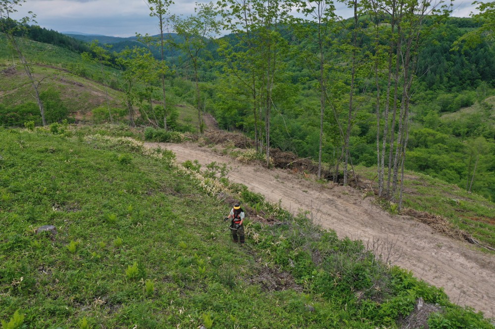 現在は、実際に山林に入り育林・伐木・草刈・調査など作業を担う現場作業員(通年雇用と期間雇用の選択制)と、業務課(ドローンやタブレットを使っての山林調査、現場監督、事務手続きなど)の正社員を募集しています。